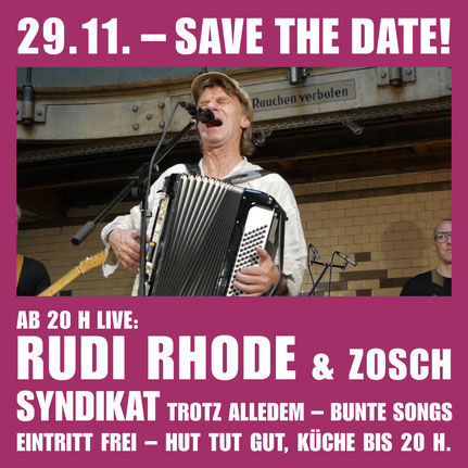 Das Zosch-Syndikat um den Frontmann Rudi Rhode präsentiert seine bunten Texte in Reggae- und Latin-Grooves, rockt und rollt, swingt und poltert. Und am Ende des Abends bleibt vielleicht ein wenig von der Hoffnung hängen, dass unsere Visionen von einer besseren Welt weiterleben – trotz alledem!